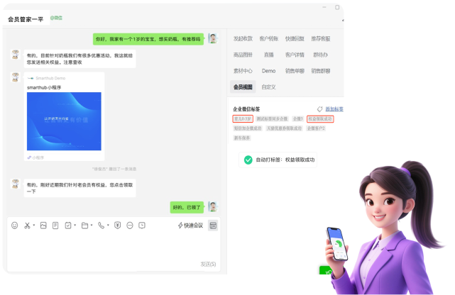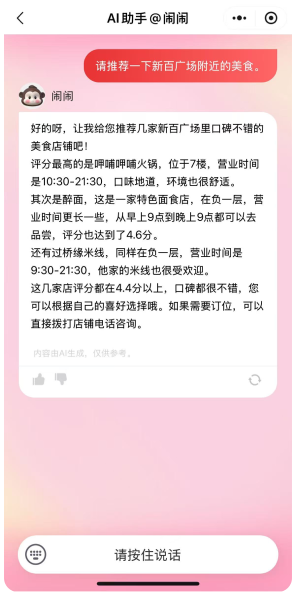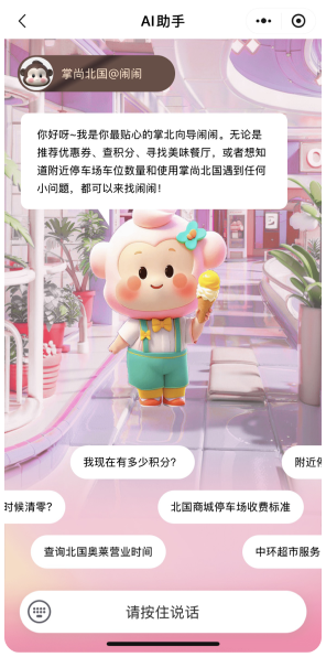核心价值:整合会员服务(积分/优惠/生日提醒等)、停车缴费、智能导流等功能,通过自然语言对话式沟通,提升用户体验